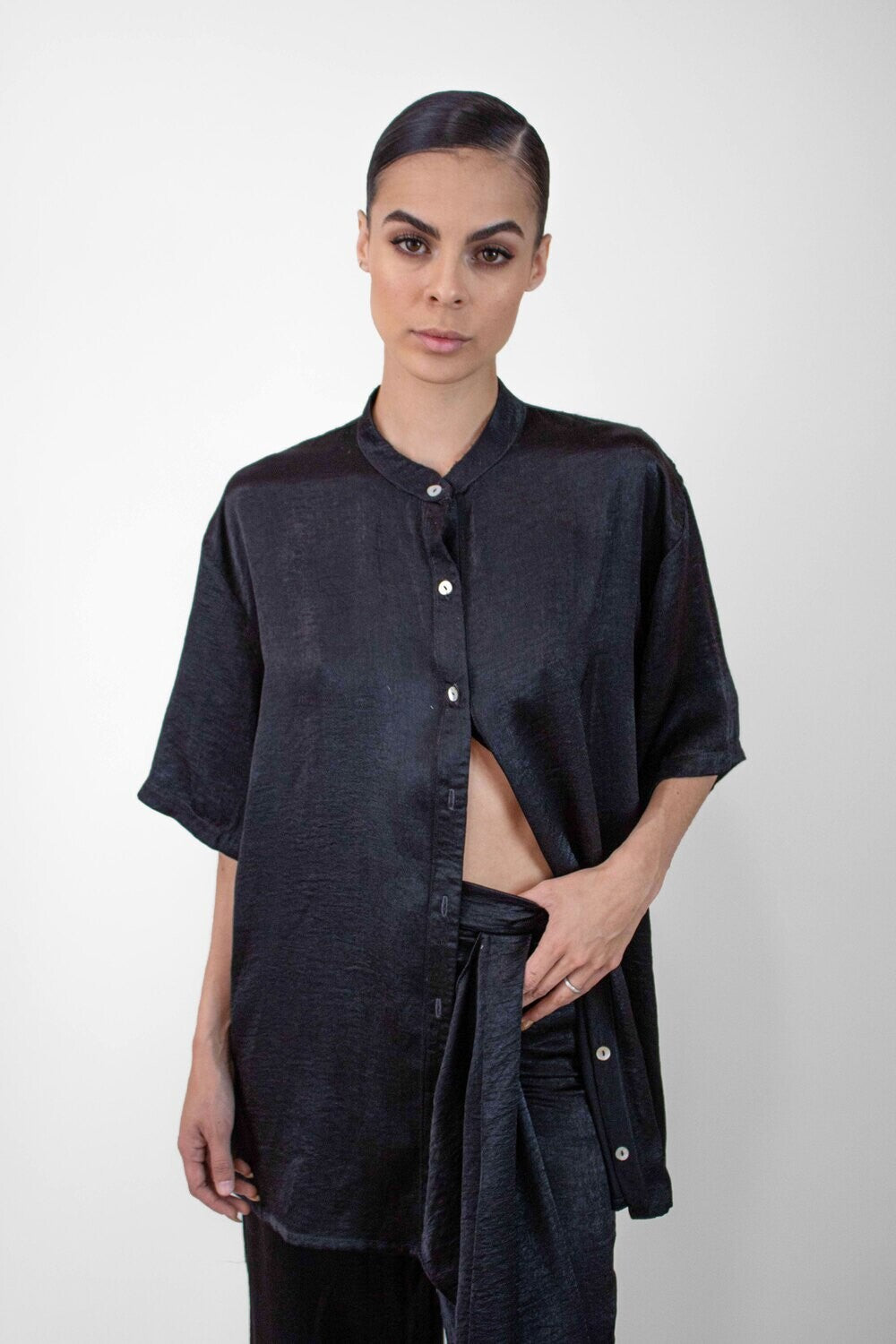Camisa negra manga corta tipo seda, largo medio, cuello mao con botones en solapa, apertura en la espalda