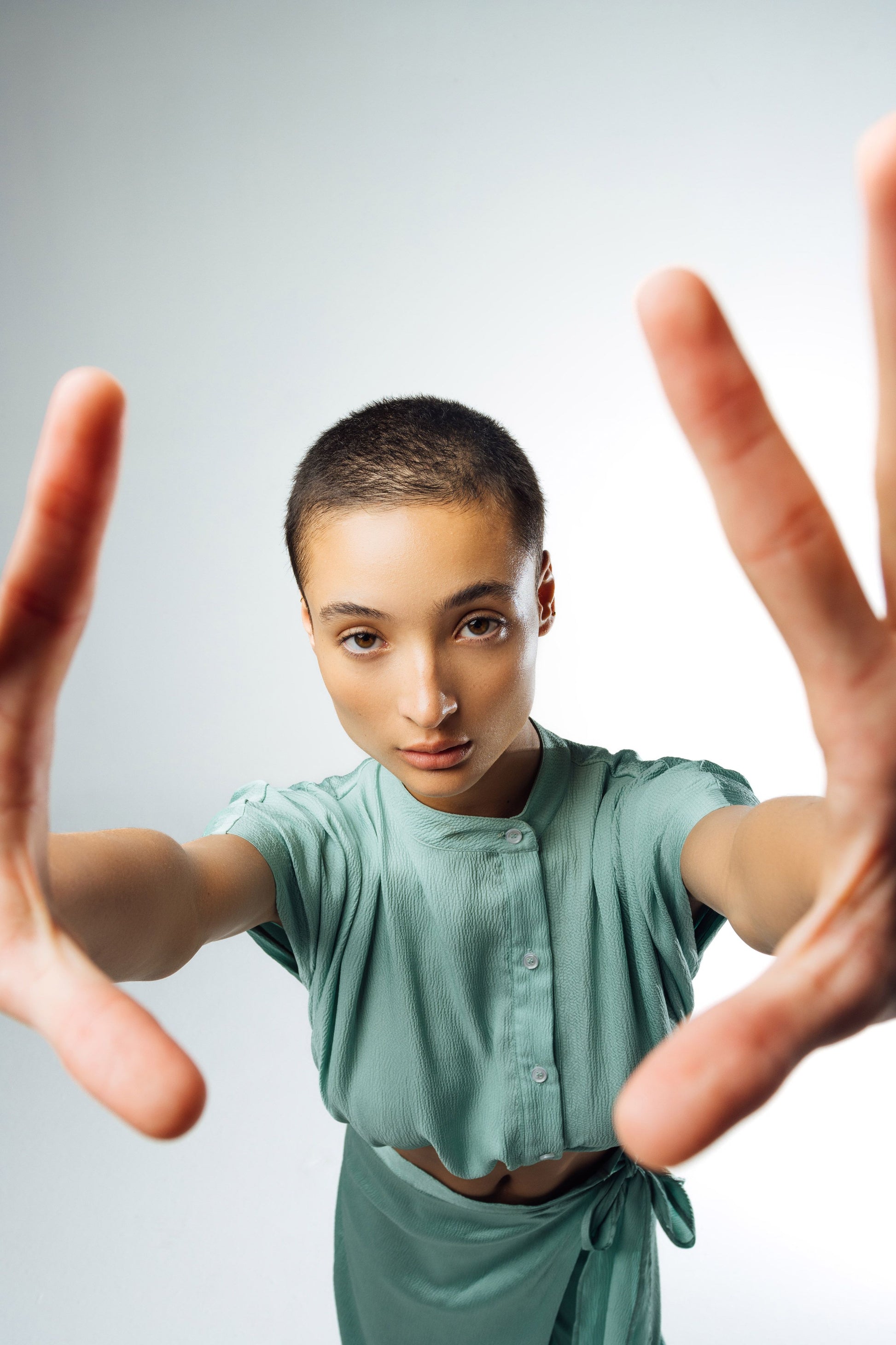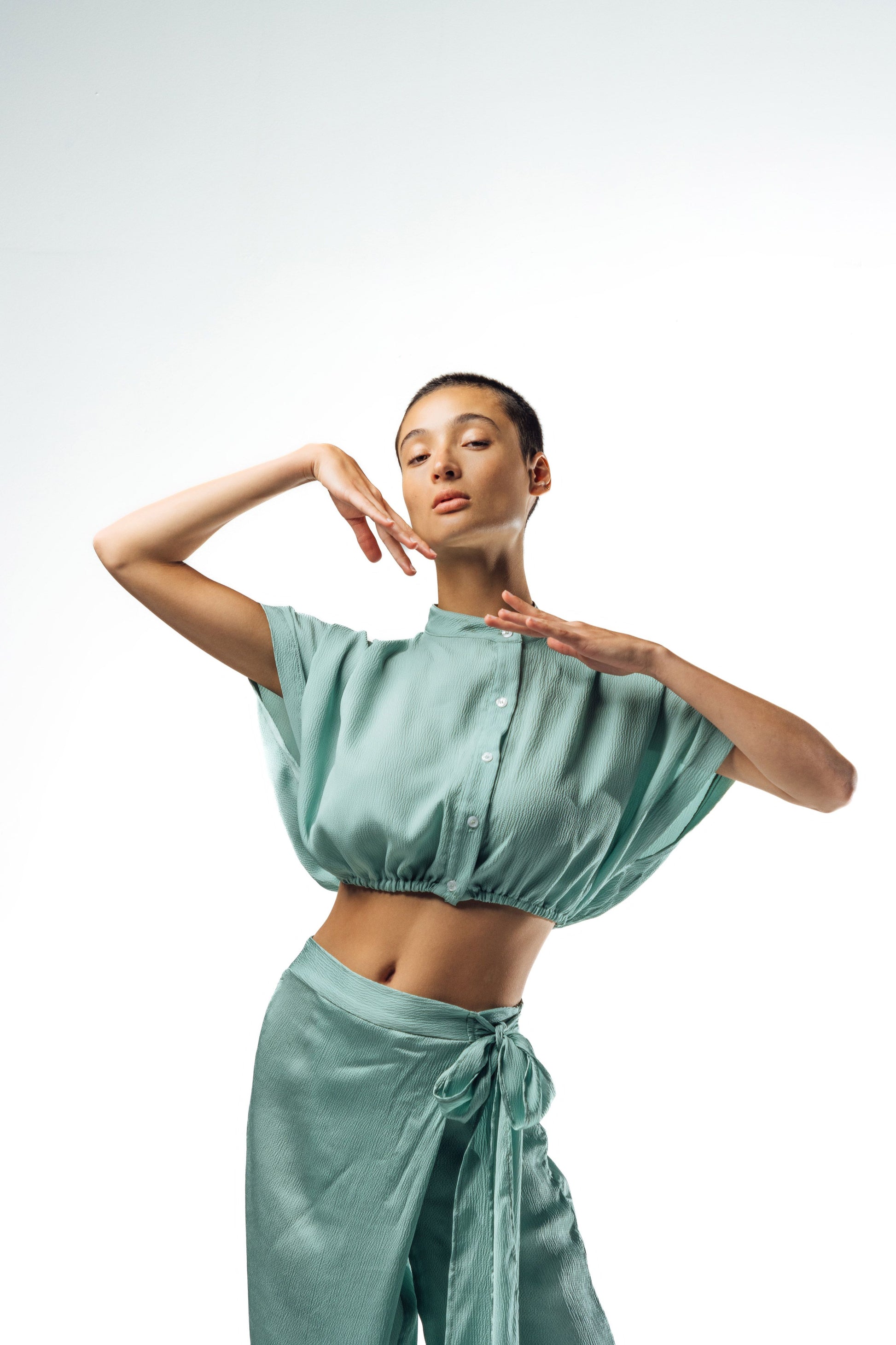 Camisa crop abotonada de manga corta amplia con pliegues en hombros, cintura elástica, cuello mao.