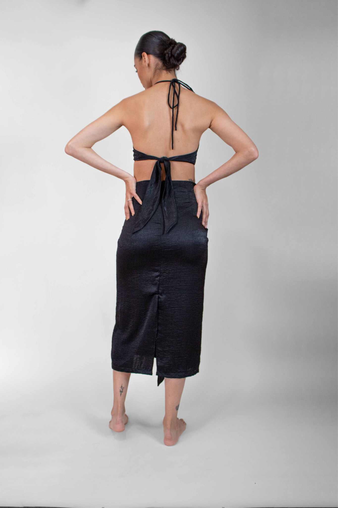 Vestido Midi con talle halter triangular y aperturas en costados, tiras con amarre de nudo en cintura y cadera, straps ajustables en cuello y busto.