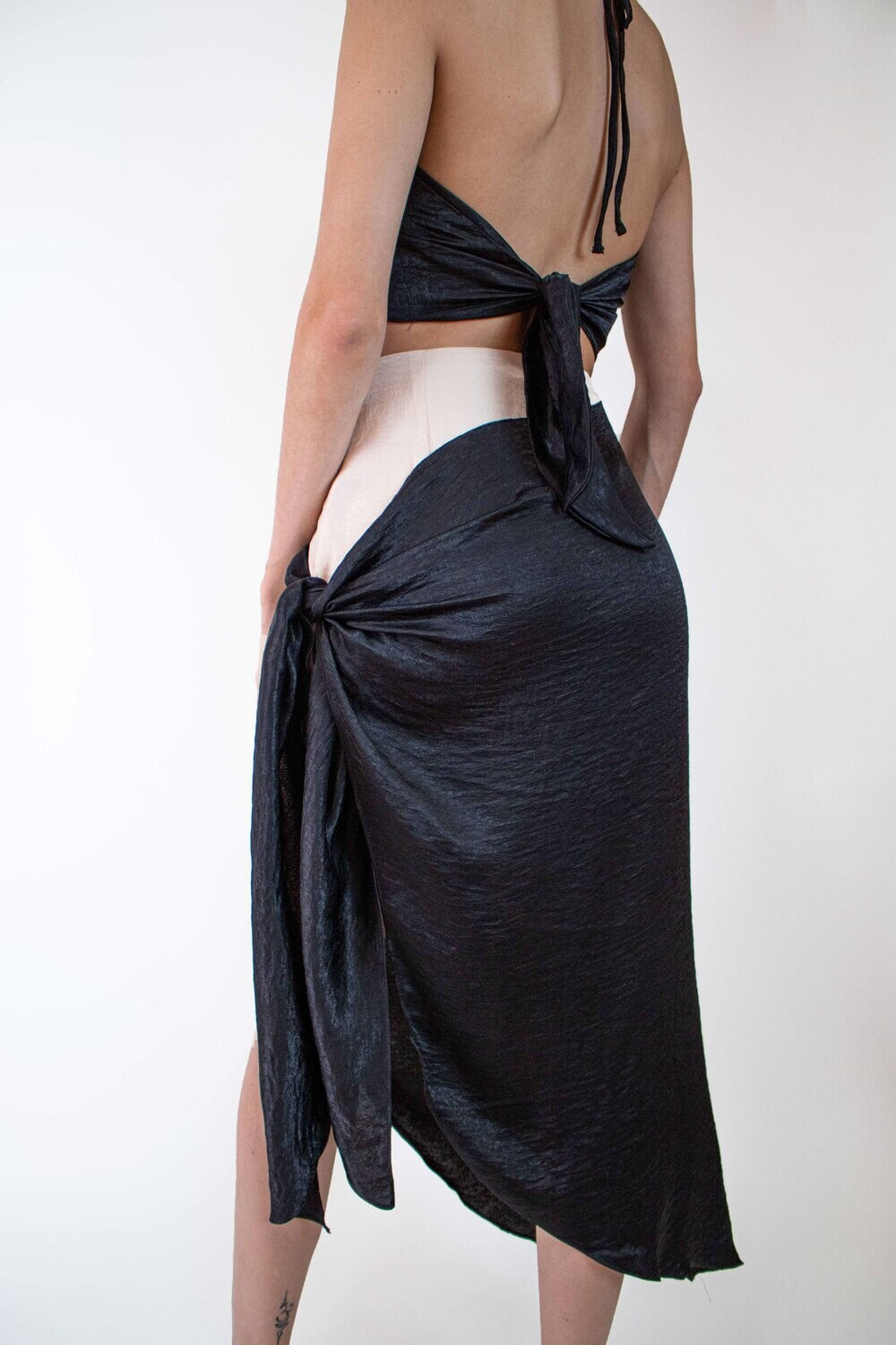 Falda corta con piezas envolventes en delantero y trasero, color negro y beige, con amarre de nudo en costado, cierre en costado