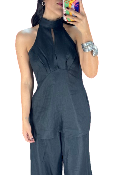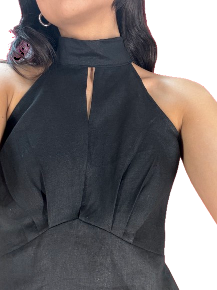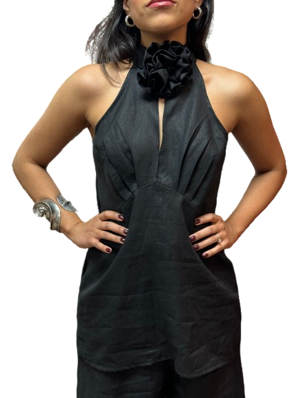 Blusa halter, corte alto en cintura con detalles de drapeado, escote de espalda y flor que se quita y se pone.