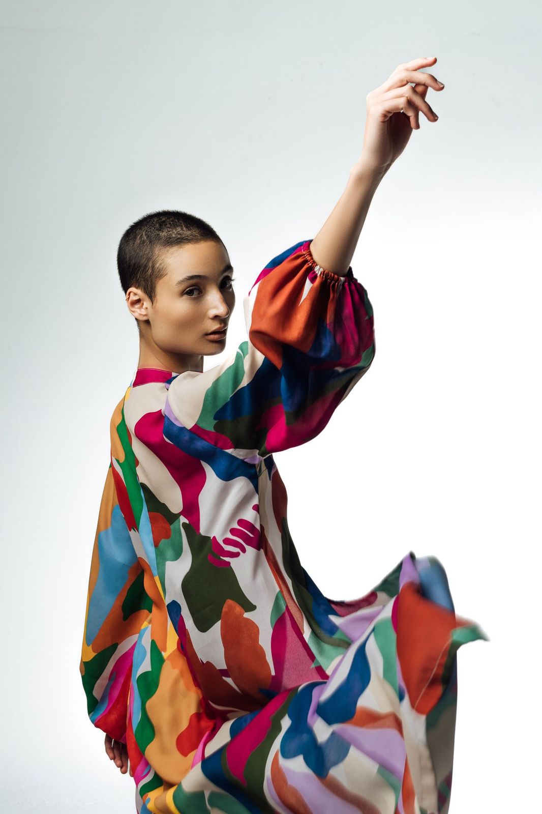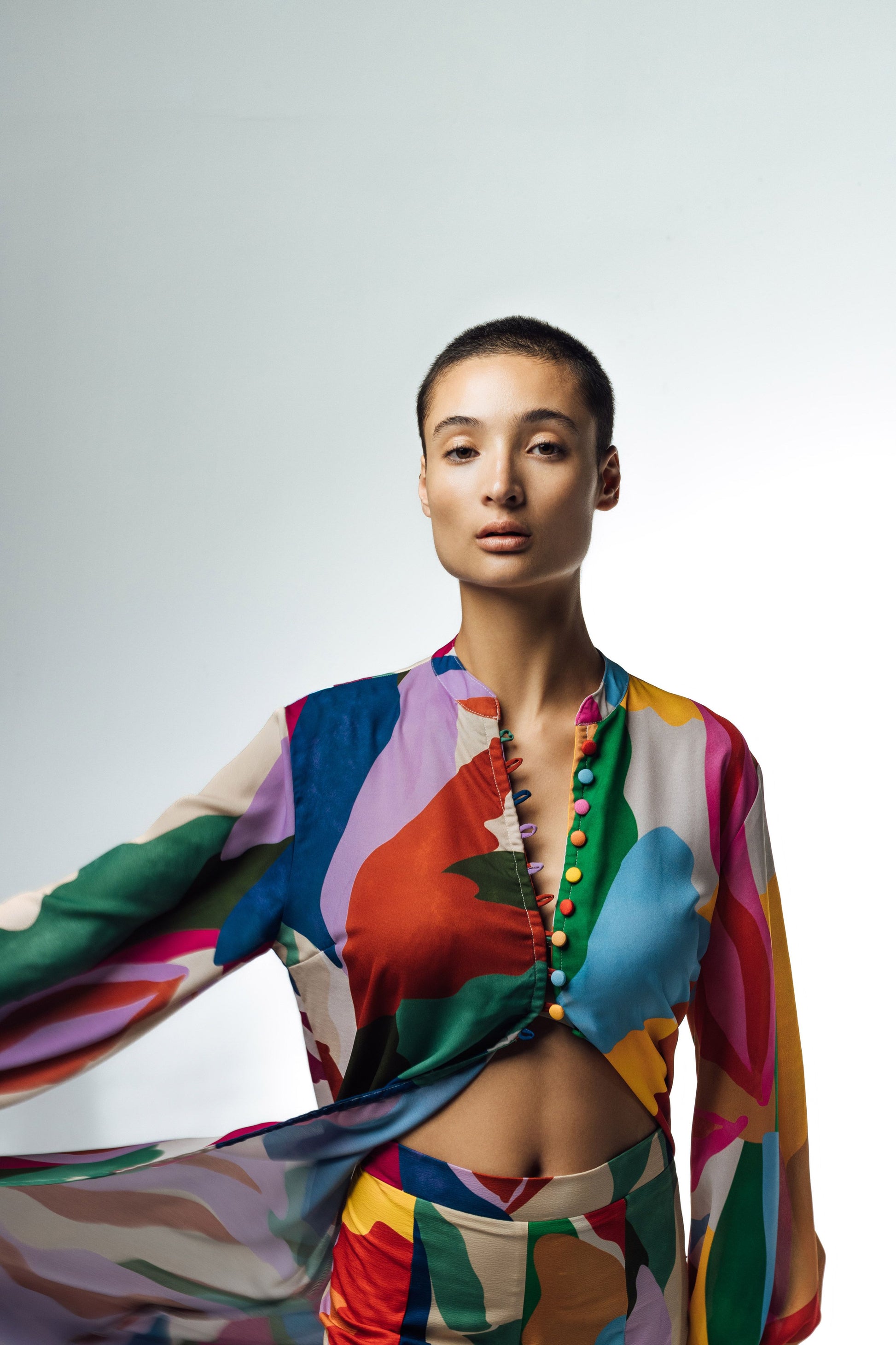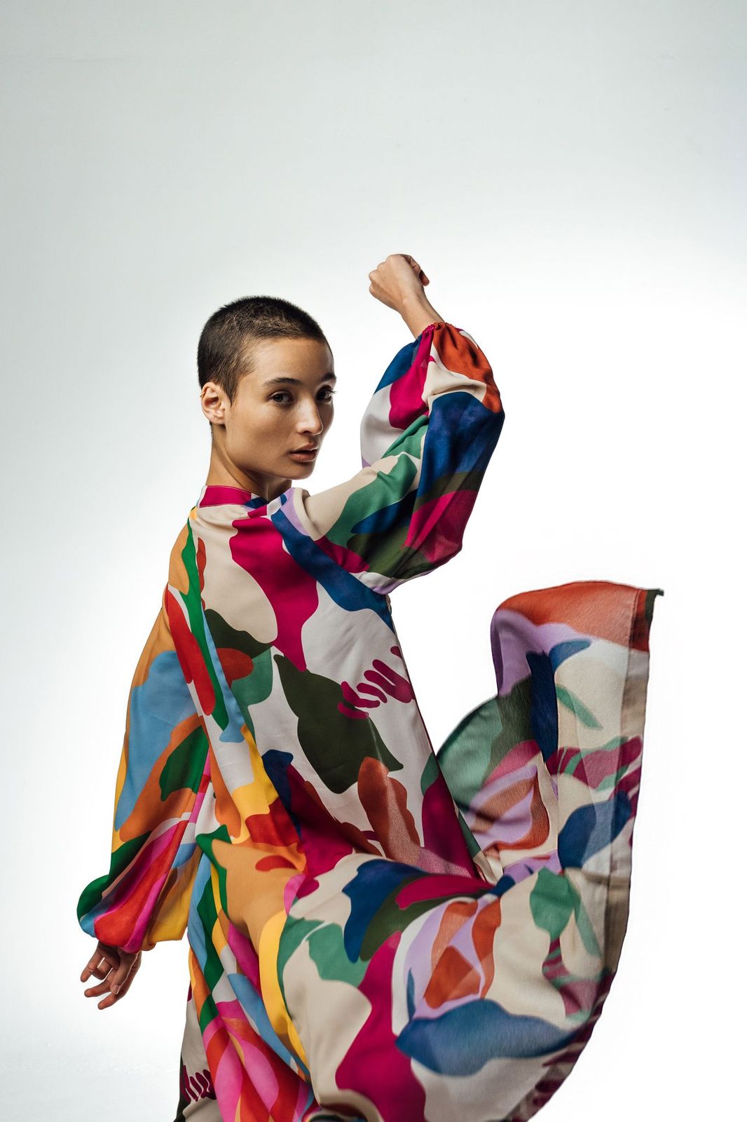 Camisa larga, cuello Mao, detalle de botones forrados hasta cintura en solapa, manga abullonada.