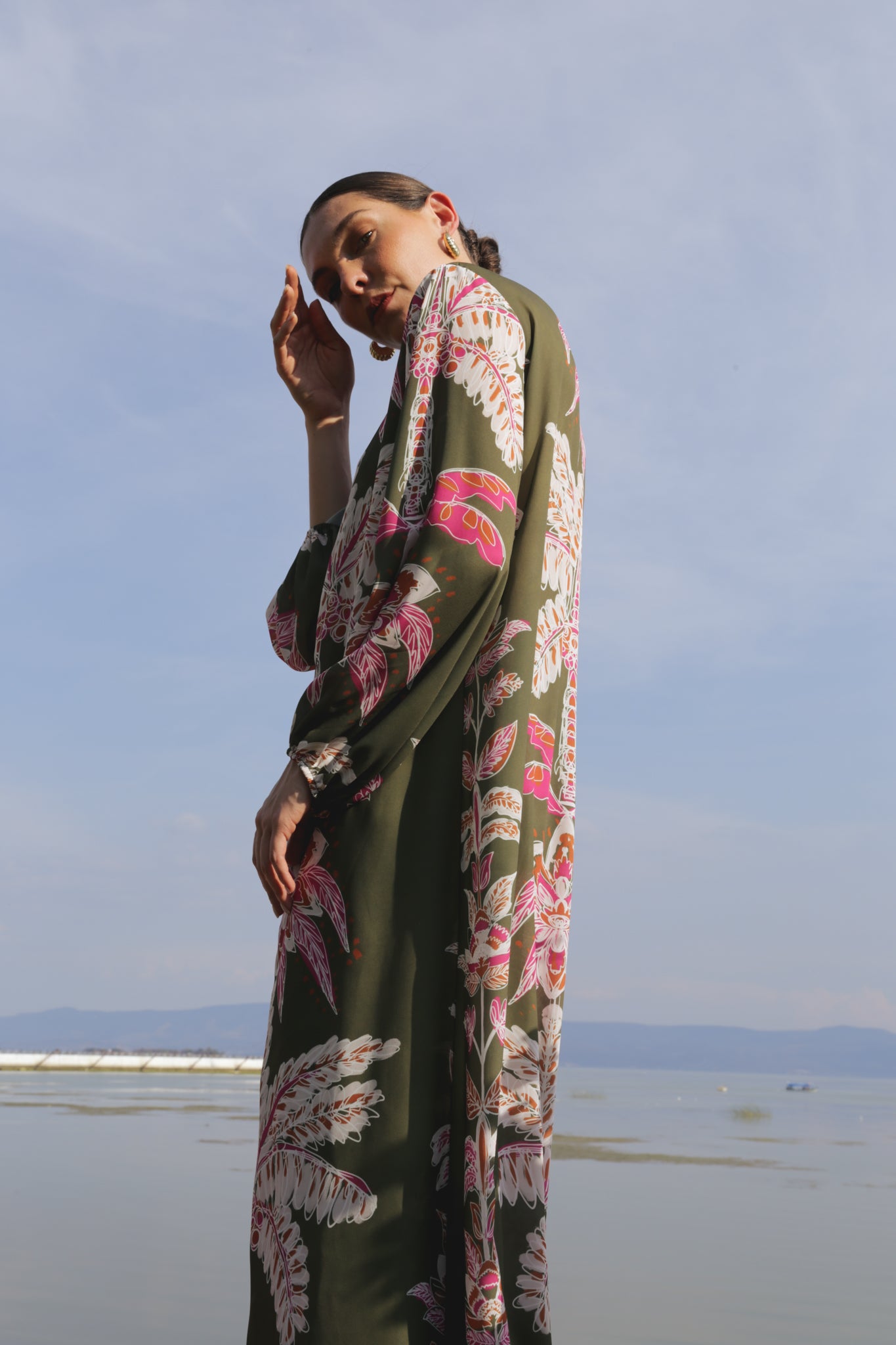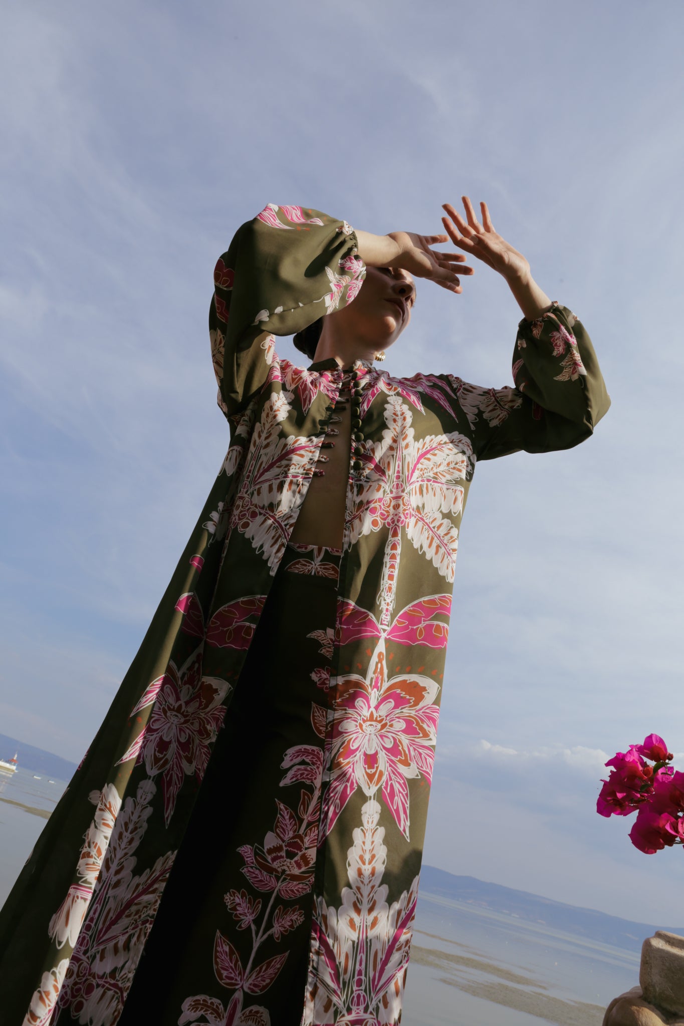 Camisa larga, cuello Mao, detalle de botones forrados hasta cintura en solapa, manga abullonada.