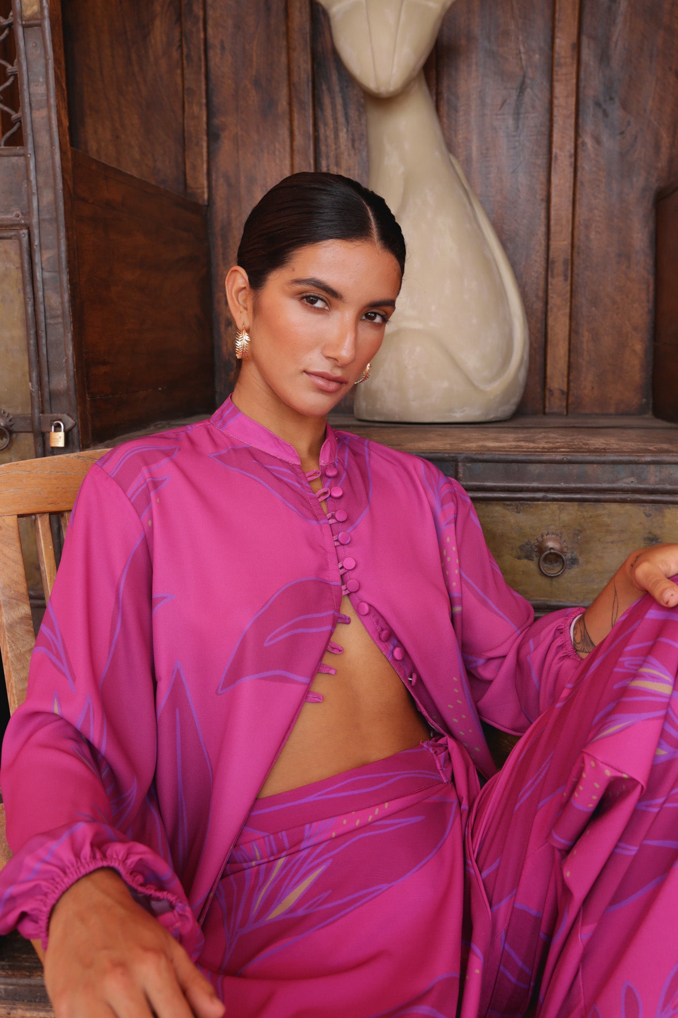 Camisa larga, cuello Mao, detalle de botones forrados hasta cintura en solapa, manga abullonada.