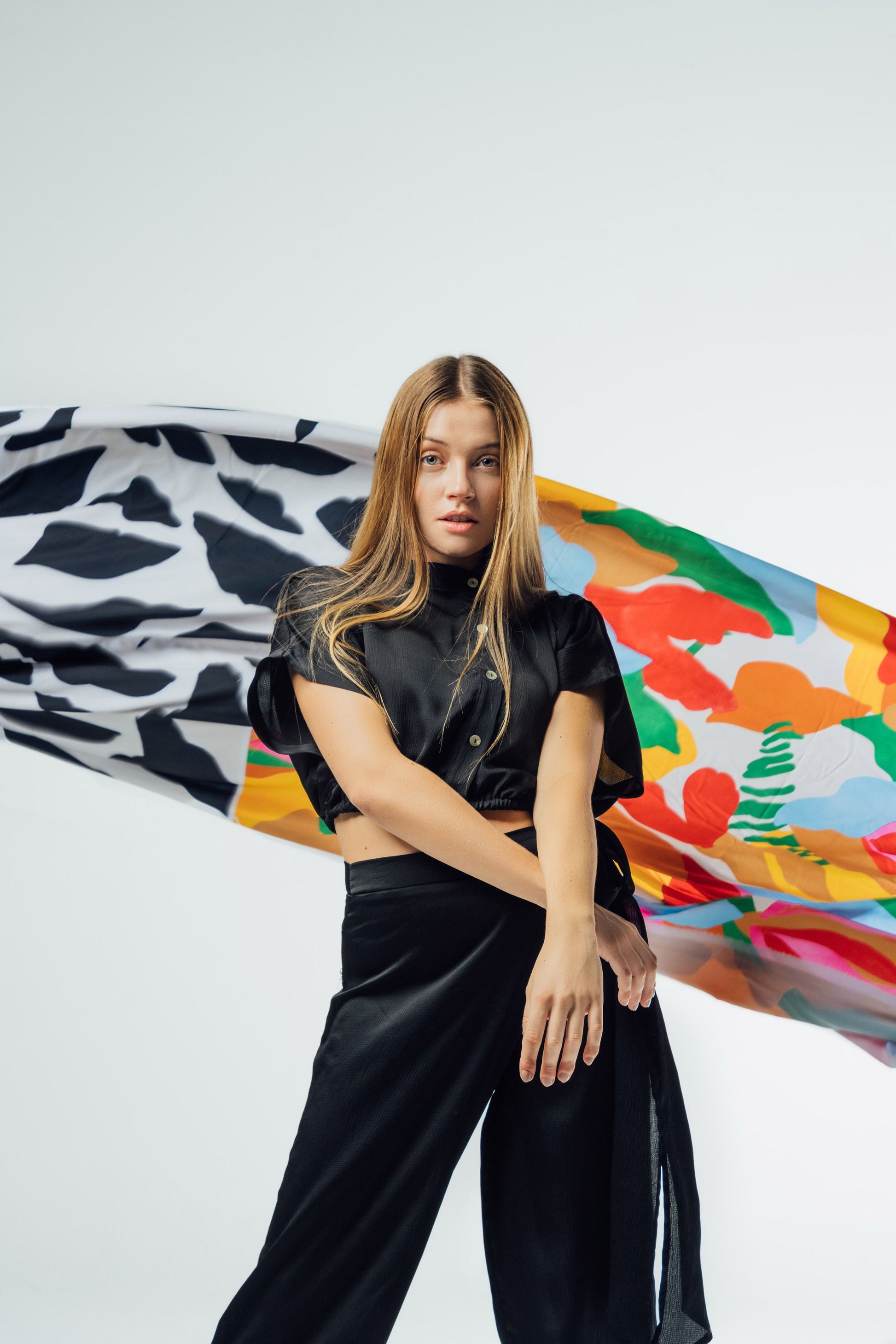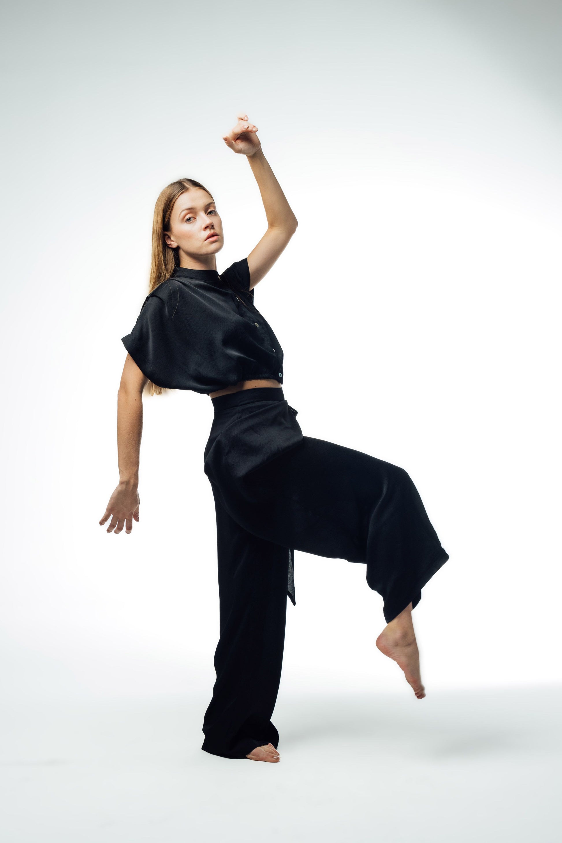 Pantalón de tiro alto con delantero cruzado y amarre de listón. Corte recto, Color negro